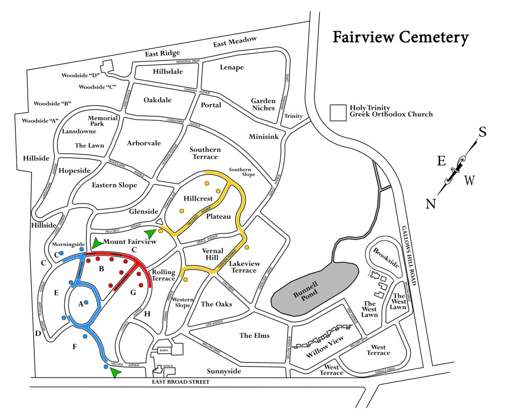 While many historically significant individuals rest in locations throughout the Fairview grounds, these designated walking routes feature some of the sites located in close proximity to one another. The routes are similar in scope and can be completed on average in about 30 to 40 minutes each. They do occur in convenient succession, however, starting with the Blue Route, which leads into the Red Route, which leads into the Yellow Route. So for a longer outing, two or three can be walked in one visit. You should expect a complete tour of all three routes to take a minimum of 90 minutes.